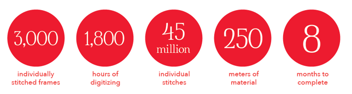 With Wilcom’s Design Library, the team was able to catalogue every frame, while the Production Worksheets provided detailed instructions for the machinists. It’s the kind of workflow efficiency embroidery businesses rely on daily—and here it was applied at a massive scale.