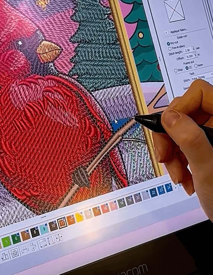 Once the artwork is ready, it moves into the digitizing stage. Using EmbroideryStudio, a touch screen, and a digitizing pen, the team selects the right stitch types, builds texture, adds underlay, and fine-tunes the sequencing for clean, high-quality machine embroidery.