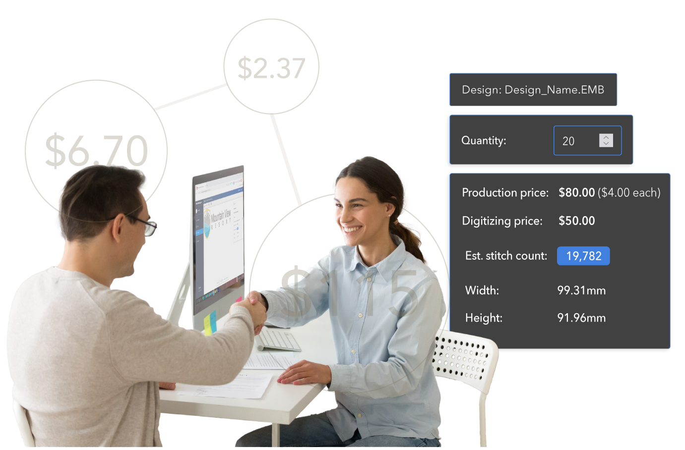 Generate visual representations of embroidery design and production pricing instantly, enabling you to provide on-the-spot quotes. This boosts customer confidence, improves your service efficiency, and results in more successful interactions.