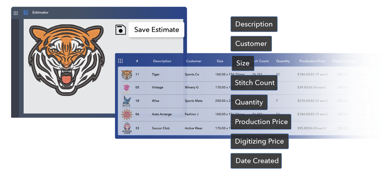 Estimator is more than just a stitch counter— it combines design digitizing and production quotes into one streamlined tool. It simplifies and speeds up the quoting process, delivering immediate and precise quotes from anywhere. This tool enables all team members to quote like embroidery experts, ensuring pricing consistency and professionalism. Save quotes and designs for future reference, simplifying customer requests and follow-ups.
