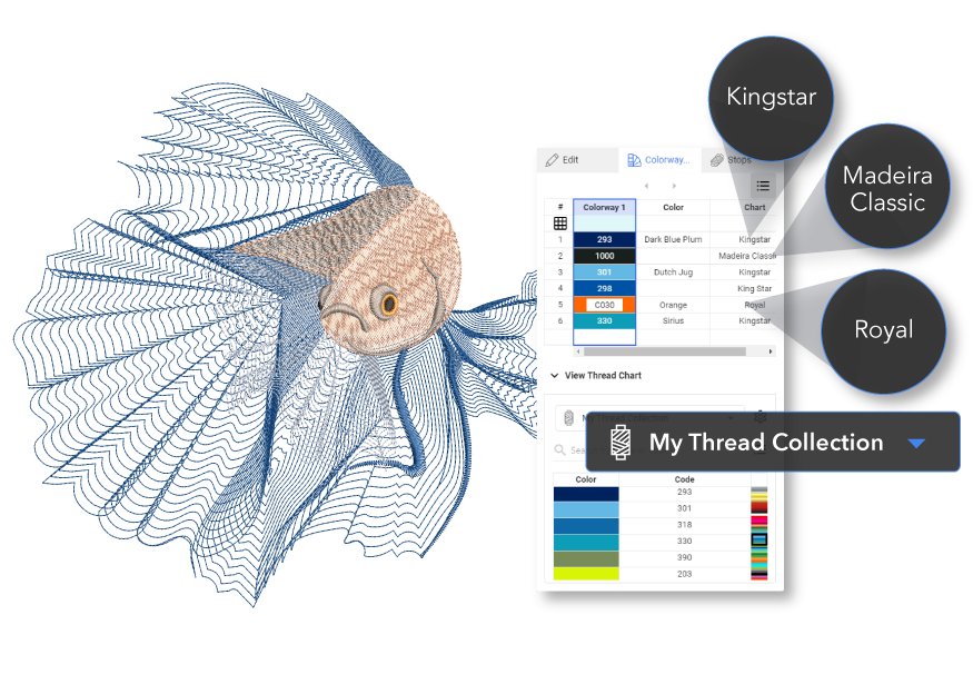 Create your own company thread collection to manage your thread brands and colors. Choose from a wide range of embroidery thread charts and save your selected colors in your customizable ‘Thread Collection’ for repeated use, saving you both time and money.