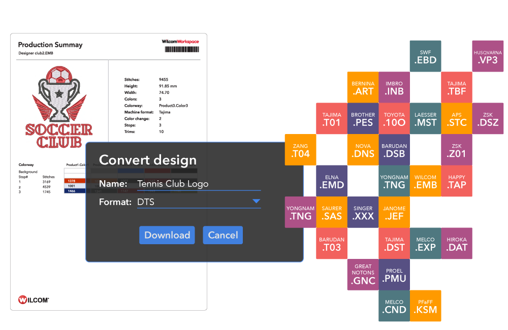 Empower non-embroidery team members to manage designs and initiate production tasks. Effortlessly generates detailed, bar-coded production reports and summaries, with accurate design and precise thread colorway information. Additionally, it offers seamless export and conversion capabilities for embroidery designs to any commercial machine stitch file, guaranteeing a smooth handover to the production team.